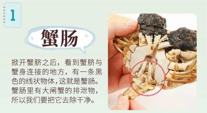 秋菊黄,蟹飘香,现在正是吃大闸蟹的好时光!特别是母蟹正值肥美,那大块大块油润的蟹黄,流淌在舌尖的浓郁鲜美,别提有多诱人了!不过,先别急着大快朵颐!在大闸蟹身上,藏有四个不宜食用的部位。在吃蟹前,先把这四个部位剔除干净,咱们吃起蟹来,才能更加健康美味!古人曾说,大闸蟹是“无肠公子”,其实不然,大闸蟹是有肠子的。我们把蟹翻过来,在蟹腹上有一块蟹脐,公蟹的蟹脐为宝塔形,母蟹的蟹脐为半圆形。把蟹脐掀开后,一条黑色线状物体隐匿其中,这就是大闸蟹的肠子了。蟹肠是排泄通道,十分肮脏,因此要把它剔除干净,不能食用。掀开蟹壳,入目皆是红灿灿的蟹黄,可真是“壳凸红脂块块香”!但需要小心的是,大闸蟹的胃部,就藏身在诱人的膏黄之中。蟹胃位于蟹壳的上半部分,形如三角形的包囊,内藏泥沙,味道苦涩。如果一不小心吃了下去,还以为蟹黄是苦的呢!因此,我们要先把蟹胃去除,才能放心品尝蟹黄的鲜美!